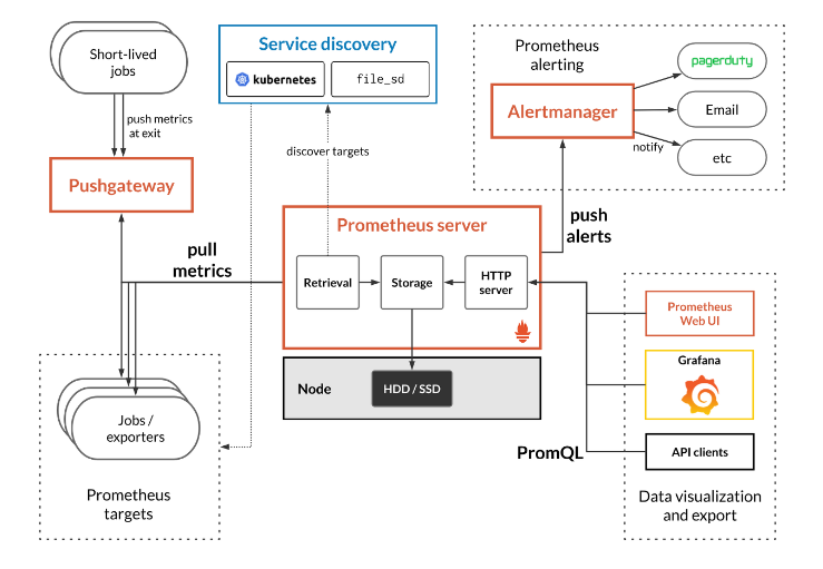 가장 중요한 것은 중앙의 Prometheus server이다. 그 중 Retrieval은 회수/수집의 의미를 가진다.